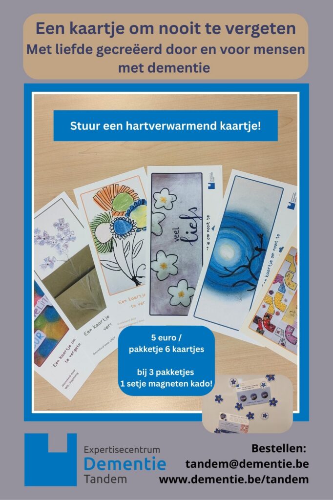 Doorbreek mee de eenzaamheid bij mensen met dementie en hun naasten, en verras en verwarm elkaar met een spontane attentie! Door deze unieke kaartjes te kopen steun je onze werking en draag je bij aan een dementievriendelijke samenleving.